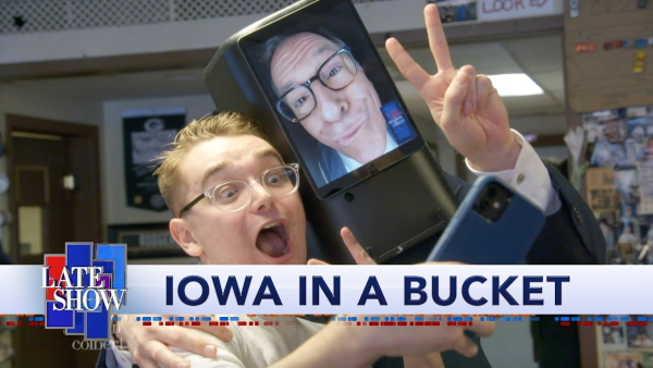 Ask-O-Matic technology allows Stephen Colbert to visit Iowa voters without leaving his couch