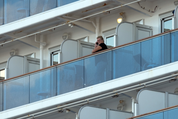 [Image: A passenger on the balcony of the cruise ship Diamond Princess, which is quarantined off the Japanese port of Yokohama. A number of people onboard have contracted the coronavirus. Credit: Carl Court/Getty Images.]