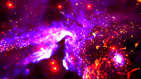 When the winds from the Wolf-Rayet stars collide, the material is heated to millions of degrees by shocks — similar to sonic booms — and produce copious amounts of X-rays. The center of the galaxy is too distant for Chandra to detect individual examples of these collisions, but the overall X-ray glow of this hot gas is detectable with Chandra’s sharp X-ray vision.