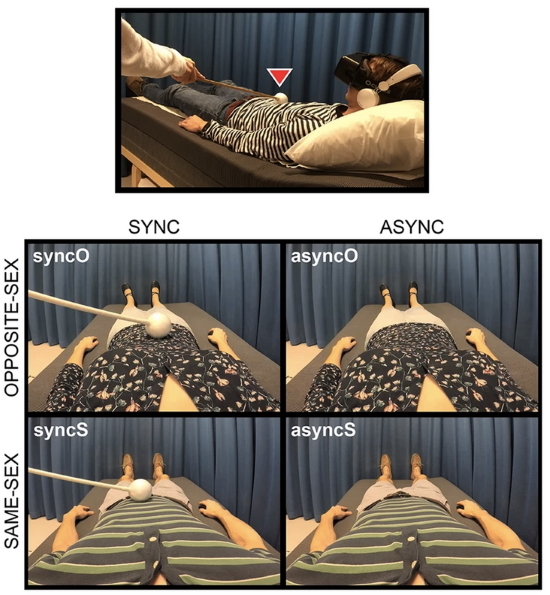 In two experimental conditions, the participants watched the stranger’s body being stroked with an object while simultaneous touches were being administered to the same body part on their own bodies. In these conditions, the touch experiences were in sync, causing the illusion that the stranger’s body was their own (synchronous conditions). In two control conditions, the participants received touches that were out of sync with the video, breaking the illusion (asynchronous conditions). Before and after each condition, the subjects completed ratings of how masculine and feminine they felt.